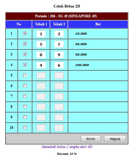 Cara menghitung hadiah secara umum adalah: nominal bet dikalikan nilai taruhan. Sebagai contoh. Nimanal bet adalah 2000 sementara nilai taruhan adalah x 300 maka hadiah kemenangan = 600 ribu. Ini berlaku pada taruhan tanpa diskon bet. Jika Anda menggunakan diskon maka nominal bet-kurang diskon lalu dikalikan dengan nilai taruhan. Setelah mengetahui tempat dari empat keluaran togel, langkah pertama kita perlu angka keluaran togel macau awal. Misalnya awalan 4d ialah 8639, kita jumlah As dengan Kop serta kepala dengan ekor (8 + 6) (3 + 9). Bila telah kita kali djua penjumlahan barusan dengan angka 4 ( 14 x 4 = 56 ) ( 12 x 4 48 ).